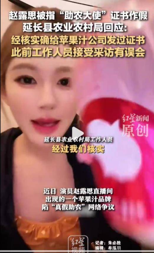 之后,又有网友质疑该苹果汁品牌关联公司延安小小的果实农业科技有限公司“助农大使”证书公章造假。13日晚间,延长县农业农村局工作人员告诉记者,经核实,他们的确给苹果汁品牌方企业颁发过“助农大使”称号,但未对任何个人发过。