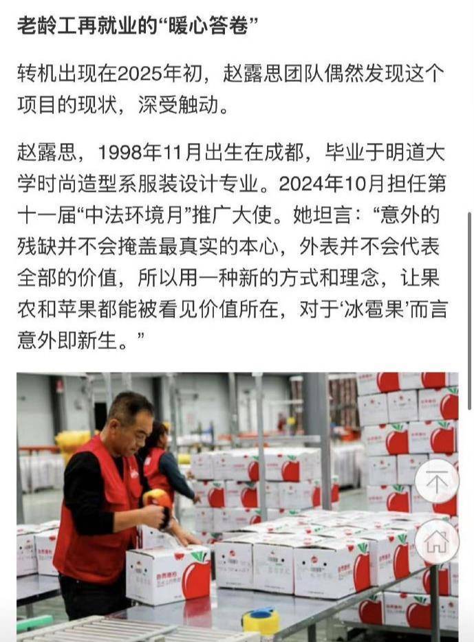 这一说法,在网络上被盛传为:赵露思团队以正常市场价格将陕西地区4000余户果农滞销的600吨冰雹苹果,收购并制成果干、果汁出售。然而,据2025年5月4日的原始新闻报道所述,收购冰雹果的事是当地一家名为“自然搭档”的企业做的,而且是从2022年就开始做了,赵露思团队于2025年初关注到这个项目,并帮其做视觉设计,助力其品牌化,打开销路。