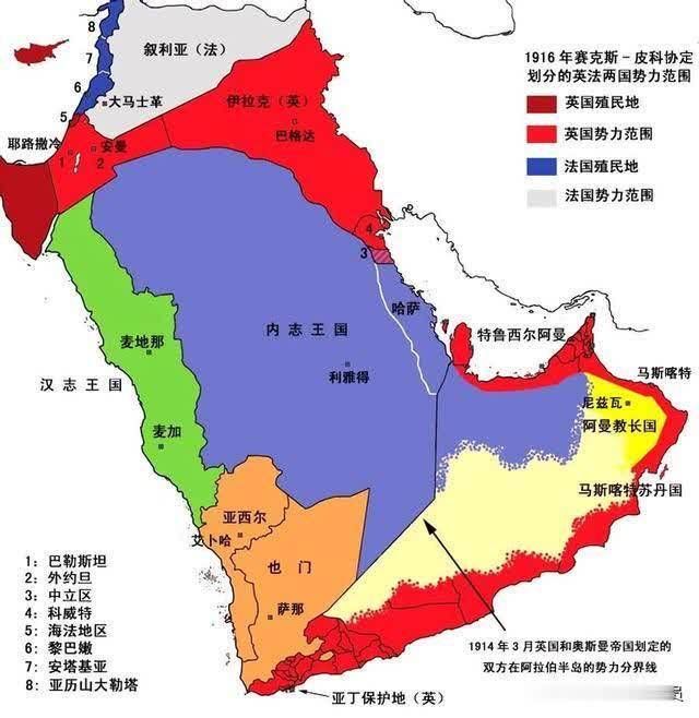 一战结束后,奥斯曼帝国作为战败国惨遭瓜分解体,除了英法等国直接占领的区域外, 原奥斯曼帝国治下的阿拉伯地区,很多家族都有野心,尤以汉志的哈希姆家族和内志的沙特家族为甚。