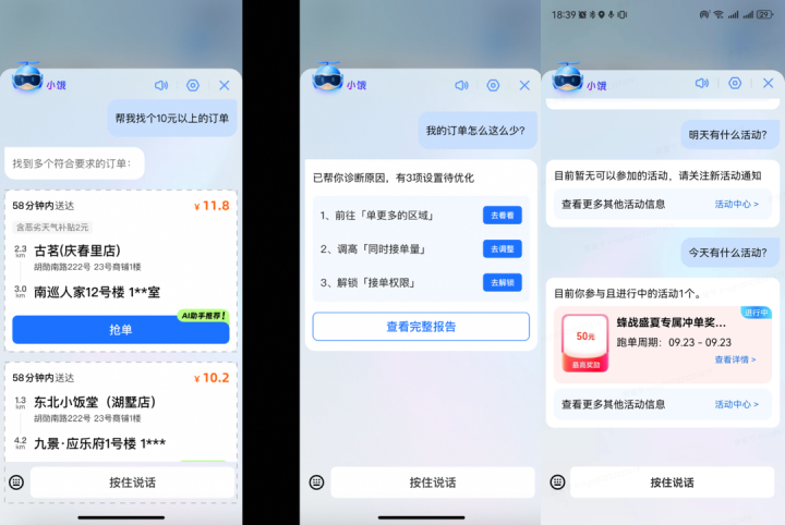 针对“接单难”等问题,小饿新增了主动帮你“要单”、诊断派单情况、查询活动等实用功能。不用再频繁看手机,跑单更安全。这些功能已于9月24日在上海、北京、兰州、西安等地灰测中,10初全国推广上线。
